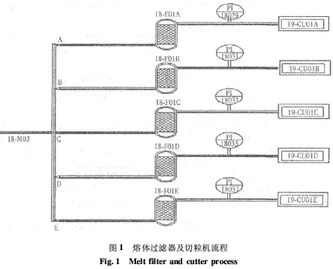 1熔體過濾器后管道壓力和流量的關(guān)系我公司新建的PET裝置,終聚釜的熔體經(jīng)過瑪格泵輸送后,通過電動(dòng)六通閥18M03,再經(jīng)過5臺(tái)單獨(dú)的熔體過濾器,分別送到5臺(tái)切粒機(jī)切粒,流程見圖1。